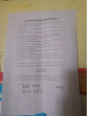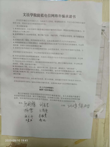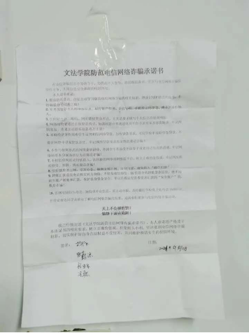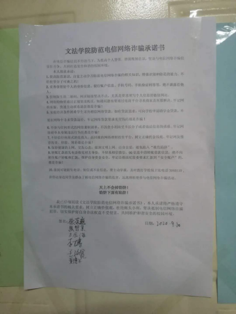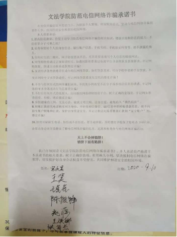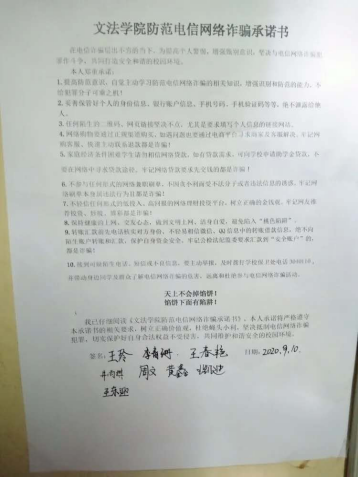 为增强学生辨别意识,共同打造安全和谐的校园环境,9月10日至17日,文法学院组织开展防诈骗专题教育活动之承诺篇。