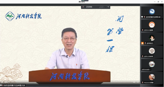 首先,师生们观看了中央领导人、省委关于疫情防控的重要指示视频。随后,校党委书记周志远,副校长冯启高分别结合习近平总书记“七一”重要讲话精神、“四史”宣传教育、“把灾难当教材 与祖国共成长”主题教育活动等内容,讲述了全省上下防汛救灾、疫情防控的河南故事和科院故事,介绍了学校关于抢险救灾、疫情防控的相关工作,赞扬了全校师生迎难而上、担当作为的感人事迹,并对疫情下保障开学平安、平安开学工作的部署情况进行了介绍。校医院李艳丽医生为师生们普及了疫情防控知识。最后,学生代表张泽辉分享了自己就地参与疫情防控的体会与感悟。