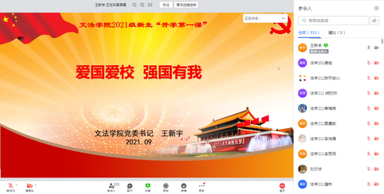9月14日上午,文法学院党委书记王新宇通过线上会议为2021级新生讲授“开学第一课”。