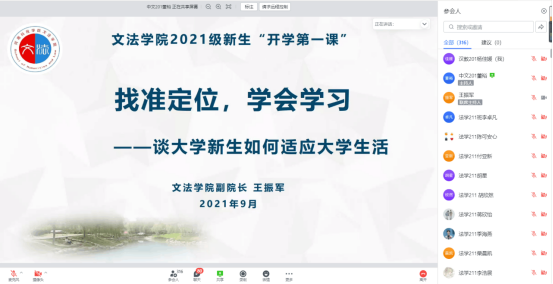 9月15日下午,文法学院通过线上会议举办“找准定位,学会学习——谈大学新生如何适应大学生活”讲座。讲座由文法学院副院长王振军担任主讲人,文法学院2021级全体新生参加了此次讲座。