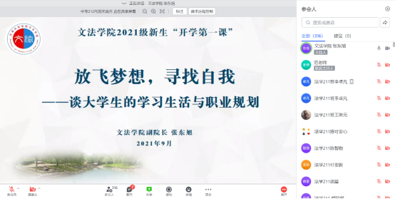 9月17日上午,文法学院通过线上会议举办“放飞梦想,寻找自我——谈大学生的学习生活与职业规划”讲座。讲座由文法学院副院长张东旭主讲,文法学院2021级全体新生参加了此次讲座。