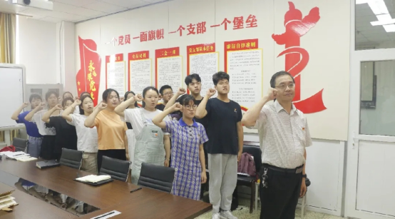 会上,王占魁宣读了新党员的名单,王新宇、邵帅等依次为新党员们佩戴党徽。随后,王新宇带领新党员们面对鲜红的党旗激情饱满的宣读了入党誓词,铭记誓言,不忘初心,擎起的右拳、坚定的声音、庄重的表情,表达了新党员始终做习近平新时代中国特色社会主义思想的坚定信仰者和忠诚实践者的决心。
