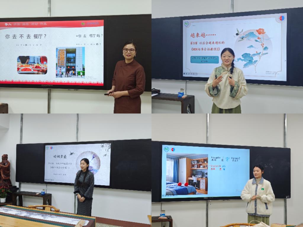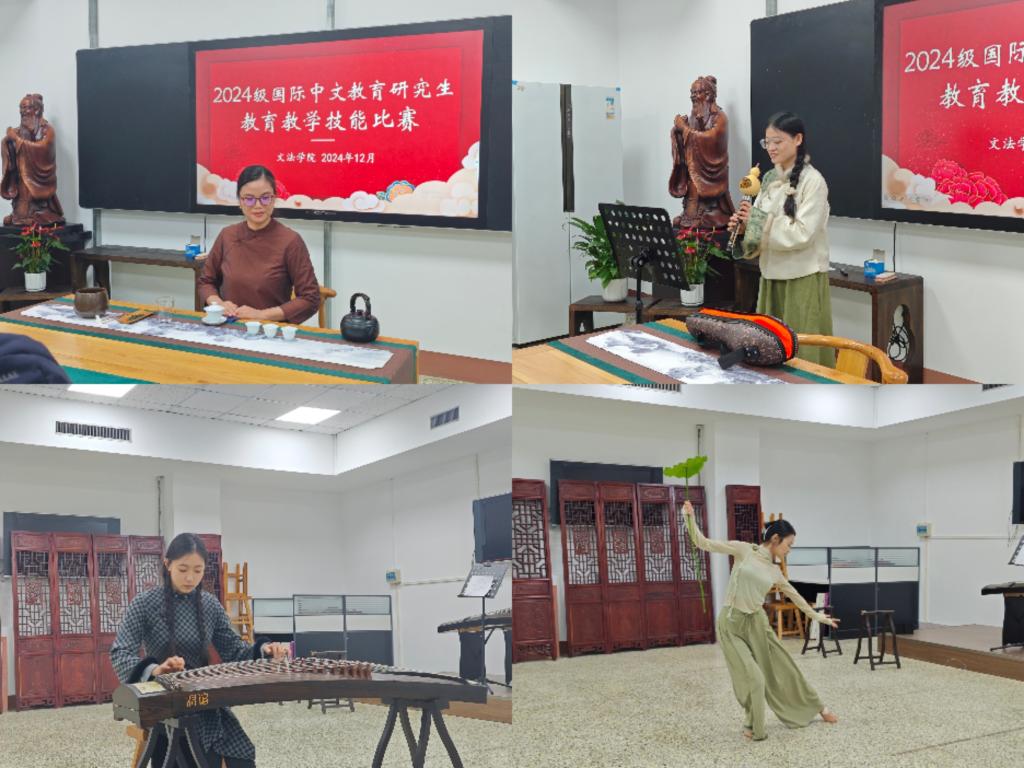 比赛前一个月,2024级国际中文教育专业研究生在宋培杰、刘晏齐两位指导教师的带领下,对比赛高度重视,精心准备,用心练习,反复打磨。本次比赛分为10分钟的教学试讲和3分钟的才艺展示两个环节。教学试讲环节,研究生们自信大方、教态自然、声情并茂,教学内容合理连贯,教学方法多样有趣,和台下师生充分互动。