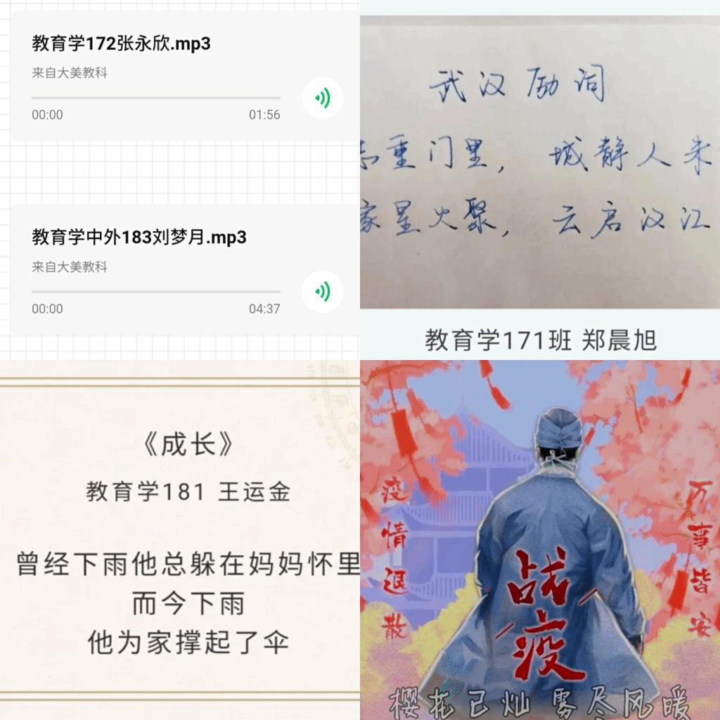 为丰富学生生活,促进学生身心健康,5月16日—18日,我院以征集“三行小诗”“制作海报”“诗歌朗诵”“绘画书法”等活动形式,通过文化作品传递抗“疫”正能量,将疫情防控、心理减压、积极心态建立等方面的知识寓学于乐,展现了当代青年大学生面对疫情勇挑重担、奋发有为的优秀品质和精神面貌。