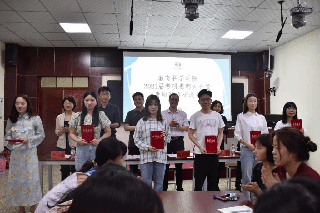 首先,王晶介绍与会领导并宣布会议开始。李小丽宣读《教育科学学院关于对2021届考取研究生个人的表彰决定》,希望受表彰学生戒骄戒躁,心系母校,继续奋斗。与会领导为考研学生代表颁奖,并合影留念。