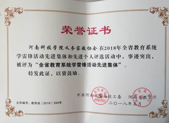 近日,中共河南省委高校工委、河南省教育厅联合下发的《关于公布全省教育系统学雷锋活动先进集体和先进个人的通知》(豫思政〔2018〕399号),表彰公布了2018年全省教育系统学雷锋活动先进集体和先进个人。此次表彰的全省教育系统学雷锋活动先进集体共100个,河南科技学院教育科学学院义务家教协会被授予“河南省教育系统学雷锋活动先进集体”荣誉称号。