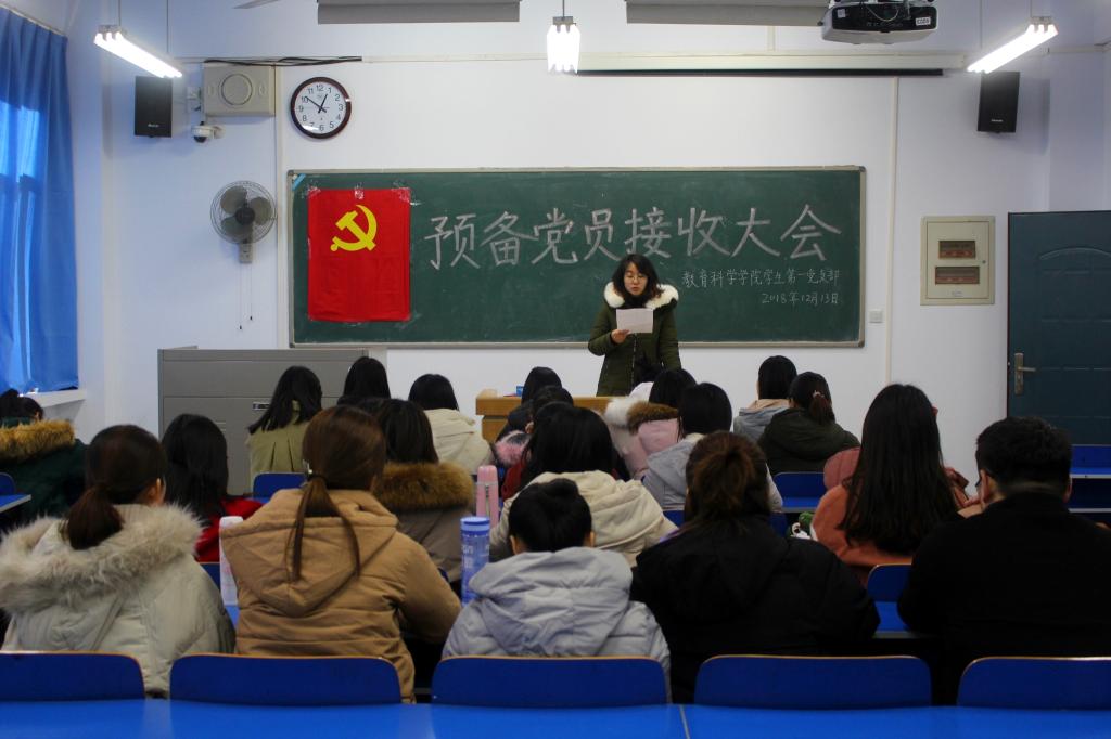 12月13日中午,教育科学学院学生第一党支部在9203教室召开预备党员接收大会。学生第一党支部书记卢璐洁主持会议。支部全体党员、预备党员参加会议。