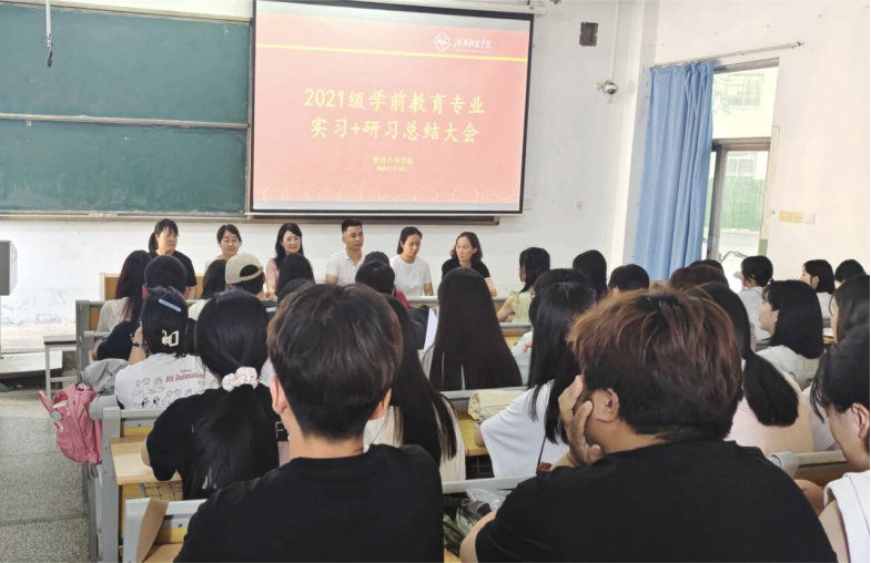 为总结2021级学前教育专业学生实习、研习工作,检阅我院“五环互动”特色教学实践体系运行成效,7月4日下午,教育科学学院在一号楼合一教室召开2021级学前教育专业实习、研习总结会,院长李小丽、副院长王晶、各小组校内指导教师及2021级全体学前教育专业学生参加了本次会议。