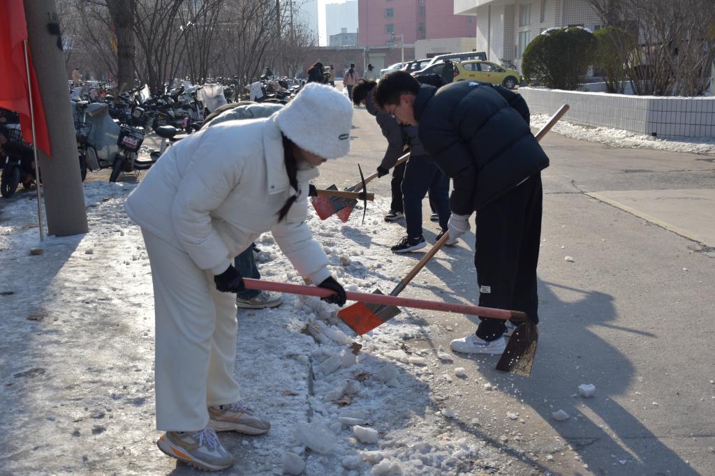 活动过程中,大家不畏凛冽的寒风,手持铁锨、铲雪铲等工具,除冰、铲雪、扫水,分工明确、有条不紊,齐心协力地将校园积雪清理干净。最终经过紧张有序的除雪扫雪,道路恢复了整洁与秩序,师生们用“小行动”保障“大安全”,为严寒的冬日带来了温暖。