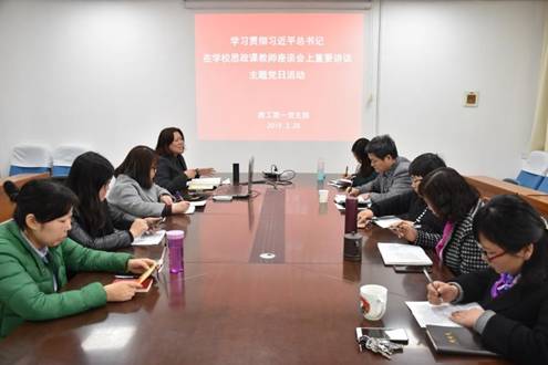 与会的各位党员教师踊跃发言,分享交流学习感悟。各位党员教师不但能够认真学习、深刻领会习近平总书记在学校思政课教师座谈会上的重要讲话精神,而且能够结合自己所教课程或从事的思想政治工作各抒己见。会上大家重点围绕习近平总书记提出的思政课教师须具备的“六要”和思政课教学要做到的“八个统一”进行热烈讨论。大家一致表示收获颇丰,学习效果良好。