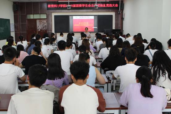 6月14日中午,我院在老图书馆四楼教学技能实训室举行2019届团委学生会主席团换届竞选大会。学院全体辅导员老师以及各年级学生干部代表100余人参加会议。