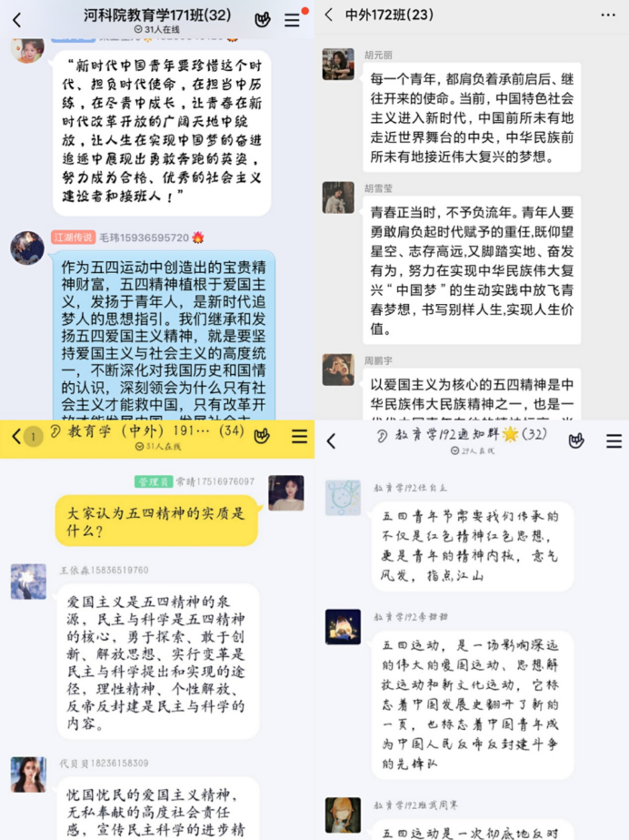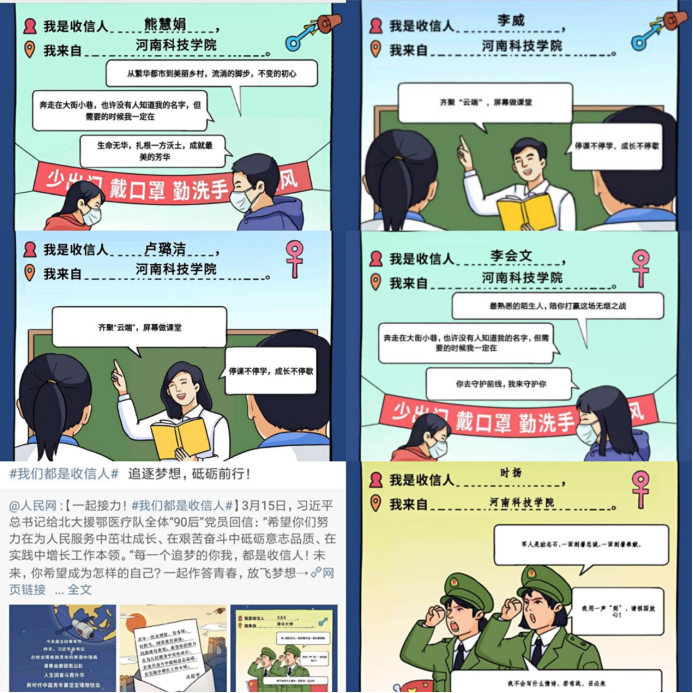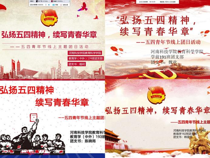 此外,5月4日,我院组织全体师生通过教育部思政司在人民网新媒体平台推出的“我们都是收信人”H5小程序积极参与学习贯彻习近平总书记给北京大学援鄂医疗队“90后”党员重要回信并进行网上交流讨论活动,同时组织全院各团支部学生认真收看、积极参与团中央举办的“让青春为祖国绽放”网上主题团日活动,感受全国各地团员青年爱国担当、团结奋进的青春风采。