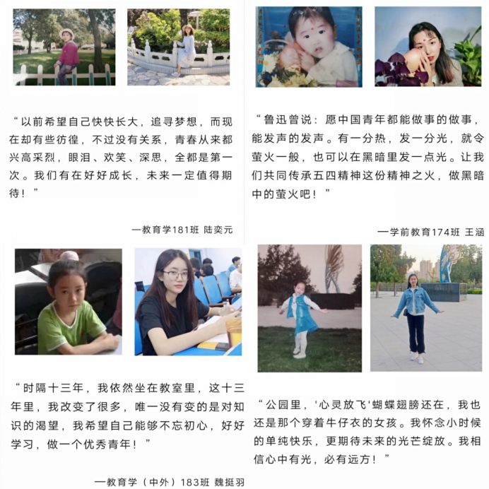“现在,青春是用来奋斗的;将来,青春是用来回忆的”。4月28日—5月1日,我院组织开展“‘匆匆那年,青春宣言’—亮出你的照片”活动,通过对比新旧照片,展现不同时期青年学生的成长变化。同时,青年学生撰写青春寄语,亮出青春座右铭,表示会切实肩负起时代使命,接好历史接力棒,燃烧青春“卡路里”,跑出人生“加速度”,勇做时代奋进者、开拓者、奉献者。