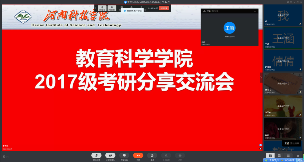 为帮助2017级本科生更好地了解考研形势,明确考研规划,调整复习方法,提前营造良好的考研氛围,6月4日下午3时,我院通过钉钉平台举办线上考研经验交流会。会议邀请2016级优秀考研学生代表苏灵敏、赵倩倩、赵巧飞、崔嘉分享考研经验,2017级全体学生参加会议,会议由正科级辅导员李威主持。