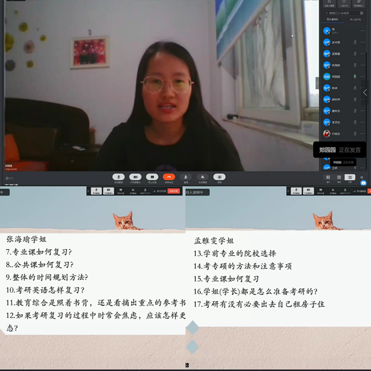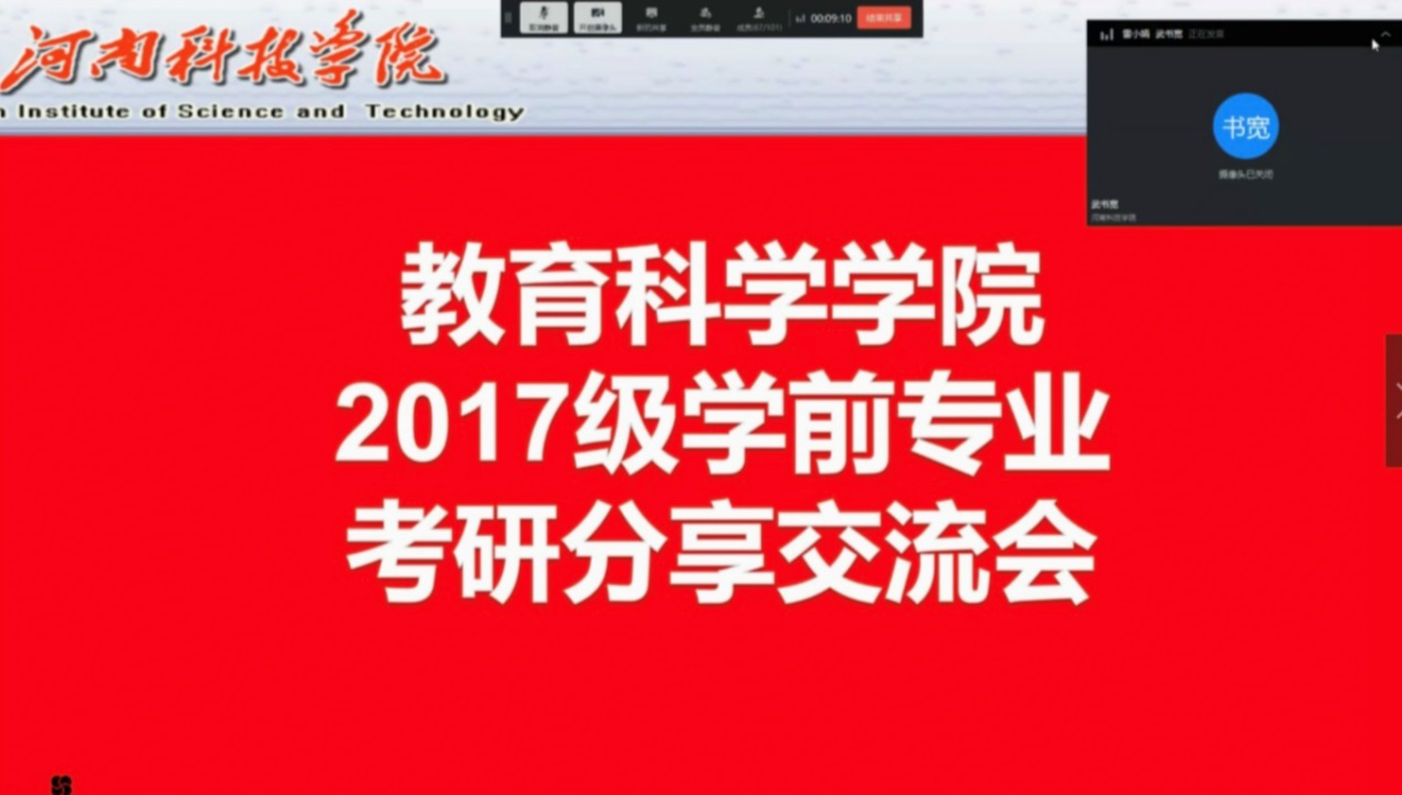为切实发挥优秀毕业生的教育引领作用,引导学院学生进一步明确学习目标和要求,增加学生的考研知识和经验,营造积极向上的学风。6月15日下午,我院通过钉钉平台召开学前教育专业考研分享交流会。会议邀请2016级学前教育专业优秀考研学生代表郑园园、孟雅雯、张海瑜分享考研经验,2017级学前教育专业全体学生参加会议。