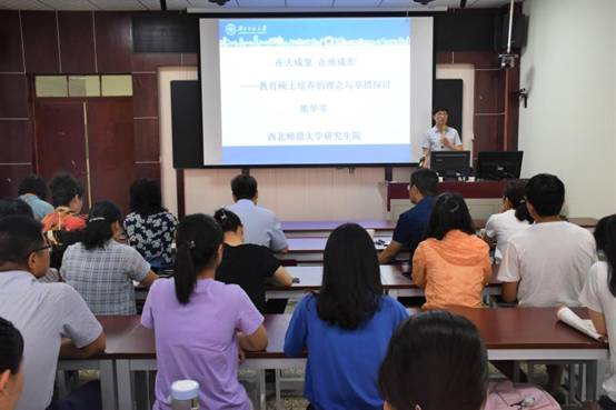 5月30日上午,应我院邀请,西北师范大学博士生导师、研究生院副院长熊华军教授在老图书馆四楼教学技能训练室作了题为“天地在心 乾坤在手——教育硕士培养的理念与举措探讨”的学术报告。学院全体教师、全体在校研究生以及其他学院相关老师和学生近100人聆听了报告。学院周启副院长主持报告会并致欢迎辞,简要介绍了熊华军教授的学术经历、研究方向及研究成果。