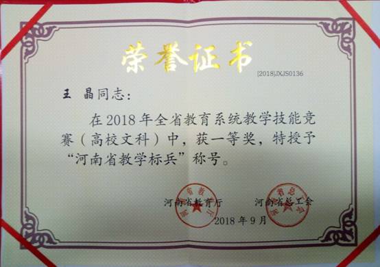 河南省教育厅、河南省总工会于2018年6月至8月在全省教育系统开展了教学技能大赛。经过个人报名和学院推选,王晶老师在我校初赛中脱颖而出,以文科第一名的成绩被推荐参加省教育厅、教育工会竞赛。经过省决赛的激烈角逐,王晶老师获得高校文科组“一等奖”,并授予“河南省教学标兵”称号。