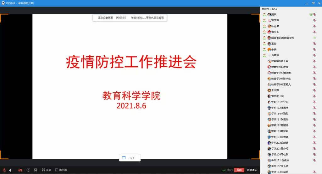 8月6日下午,我院召开线上疫情防控工作推进会,团委书记熊慧娟、团委副书记卢璐洁、辅导员张钊铭、王立霖、主要学生干部及各班班长参加此次会议。会议由熊慧娟主持。