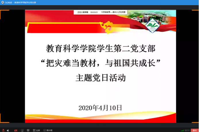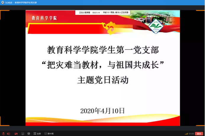 为深入贯彻落实河南省教育厅在全省教育系统中开展“把灾难当教材,与祖国共成长”主题教育活动精神,进一步激发学生党员的责任担当和斗争精神,引导广大党员把灾难当教材、把困难当磨砺,以坚定的信心和饱满的精神状态投身战“疫”。4月10日下午,我院学生第一、第二党支部开展“把灾难当教材,与祖国共成长”线上主题党日活动,学生第一、第二党支部全体成员参加活动。