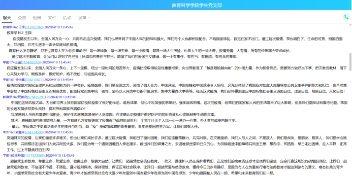 党日活动中,全体学生党员一起观看了《习近平出席二十国集团领导人应对新冠肺炎特别峰会并发表重要讲话》视频。随后,学生第一党支部宣传委员杨慧和学生第二党支部宣传委员王艺分别领学了“中国特色社会主义制度的优势”和“党旗在疫情防控斗争第一线高高飘扬”等重要内容。支部党员围绕“在‘疫情’这本教材中学到了什么”进行积极发言。学生第一党支部党员黄慧谈到,通过这次战“疫”懂得了作为学生党员一定要更加有责任、有担当,做胸有大志、心有大我、肩有大任、行有大德的青年,做合格的社会主义建设者和接班人。学生第二党支部党员张康宁说,通过这次疫情不仅充分体会到了爱国主义情怀和高尚的道德品质,更看到了中国共产党带领的中国人民在战“疫”中所展现出的中国速度、中国力量和中国精神。