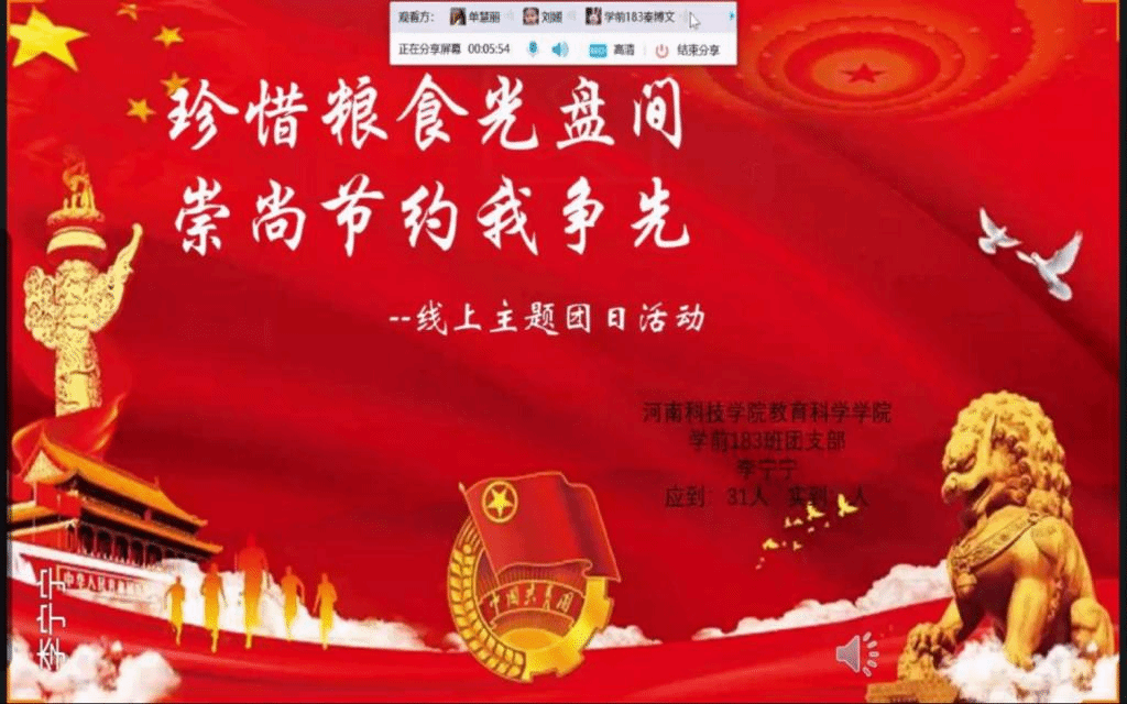 10月6日—10月8日,我院组织各团支部开展“珍惜粮食光盘间,崇尚节约我争先”线上主题团日活动。活动由各团支部书记主持。团日活动上,各团支部书记带领本支部团员青年通过共享屏幕的形式观看了“光盘行动微视频”。随后,各团支部学生针对“光盘行动微视频”和团日活动学习内容进行交流。学前教育182班刘薇谈到,一粥一饭当思来之不易,半丝半缕恒念物力维艰。我们既要做“光盘行动”的实践者,也要做“光盘行动”的推动者。教育学(中外)191班王依淼同学提出,我们要树立正确的观念,以节约为荣,浪费为耻,珍惜粮食,适量用餐。
