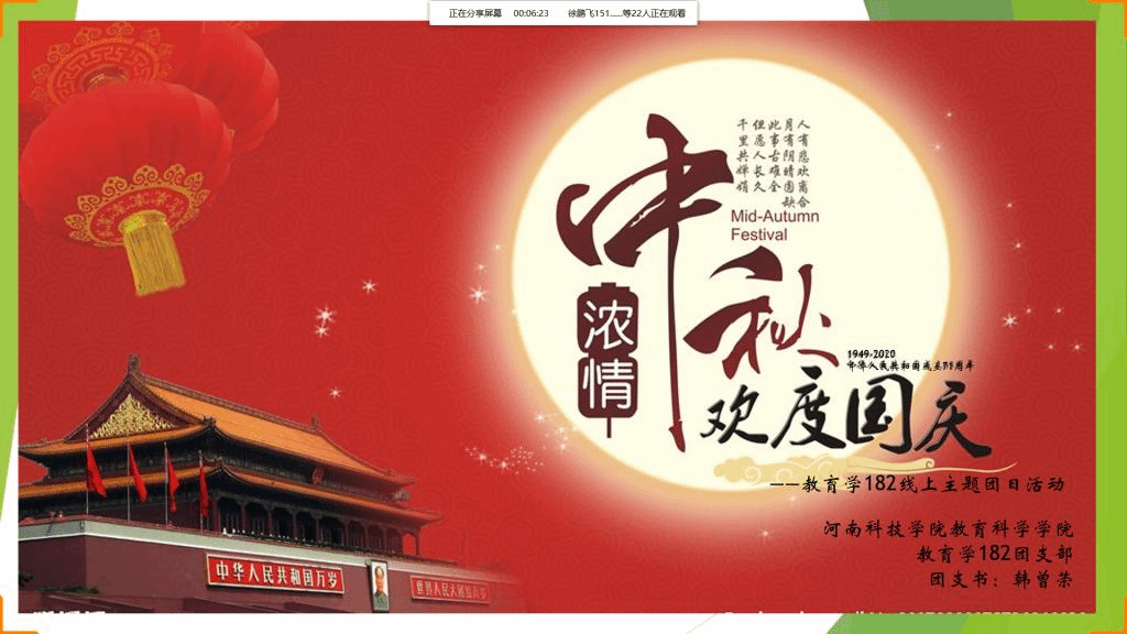 为进一步增强学生的爱国主义使命感与责任感,感受中华民族传统文化,彰显新时代青年良好的精神风貌。10月2日—10月3日,我院组织2018级、2019级各团支部开展“欢度国庆,浓情中秋”线上主题团日活动。