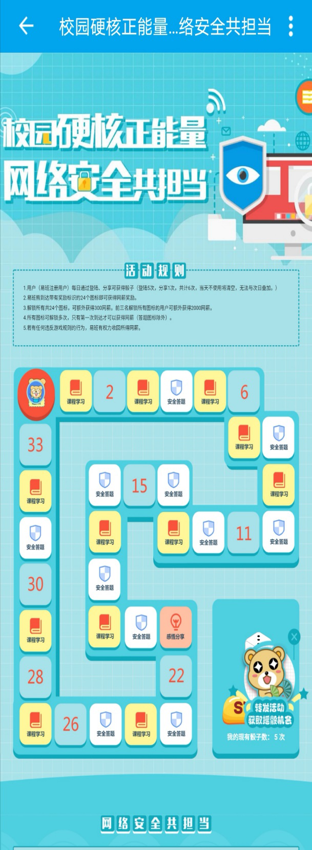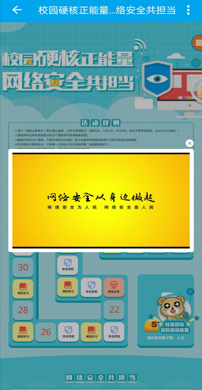 9月14日,我院组织全院学生参加由教育部思政司指导易班网组织开展“校园硬核正能量,网络安全共担当”游戏活动。本次活动以网络安全大寻访为主线,通过在线趣味益智地图游戏的形式,让学生在边玩边学的过程中了解网络安全相关知识及内容。