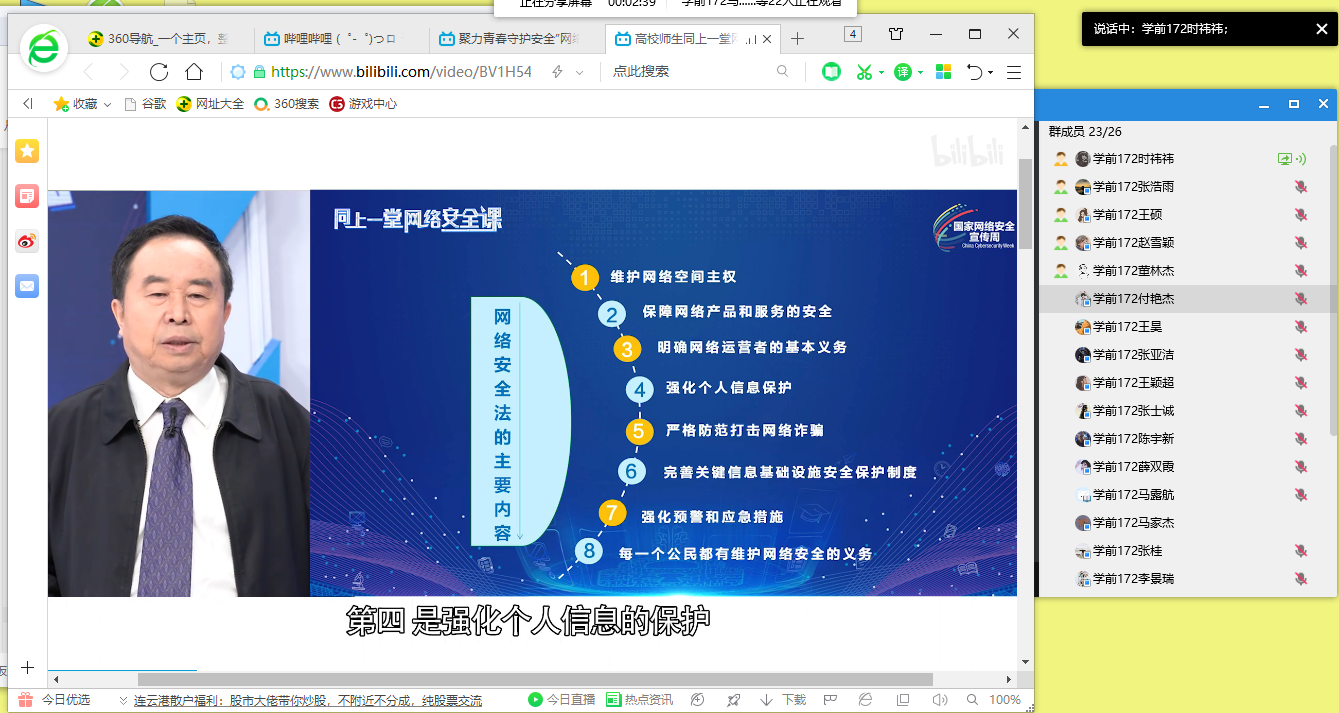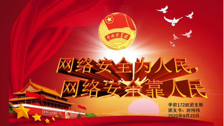 9月15日,我院组织各团支部开展“网络安全为人民,网络安全靠人民”线上主题团日活动。活动由各团支部书记主持。团日活动中,各团支部书记带领本支部团员青年观看了“聚力青春守护安全”网络公开课。随后,各团支部学生围绕网络安全谈及自身感悟。学前教育171班孟金慧说到,网上购物时,要确定采用的是安全的连接方式,以防网站将我们的个人信息出售给第三方,而且在线时也不要向任何人透露个人信息和密码。教育学(中外)183班刘梦月指出,我们要提高网络安全意识,面对校园不良网络贷款,我们要敢于向校园不良网贷说“不”,让“独立生活”和“理性消费"成为校园风尚。