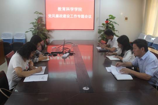 9月12日上午,教育科学学院在学院会议室召开党风廉政建设工作专题会议。院党委书记张涛、院长李建芹、党委副书记王鲁伟、副院长周启、李小丽参加会议。