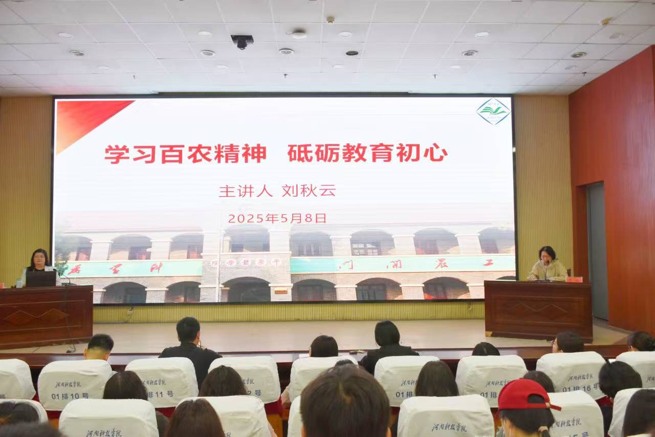 5月8日下午,教育科学学院在图书馆一楼报告厅举办“学习百农精神 砥砺教育初心”专题讲座。学院全体教师和学生代表共280余人参加活动。活动由学院党委副书记李鹏主持,学院副院长刘秋云主讲。