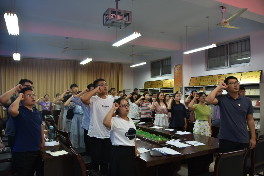 三楼会议室,在支部书记刘喜明老师的带领下,党员们面对鲜红的党旗,庄严地举起右拳,重温入党誓词,用铿锵有力的誓言,表达对党的无限忠诚和热爱。