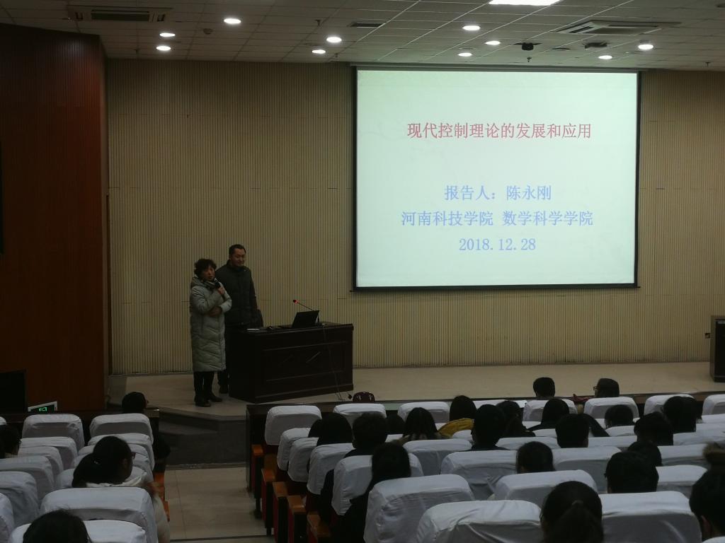 12月28日,我院校级特聘教授陈永刚博士在新图书馆一楼报告厅为大家做了一场题为“现代控制理论的发展和应用”的报告,报告由数学科学学院院长张万芹主持,数学科学学院200余师生参加了报告会。