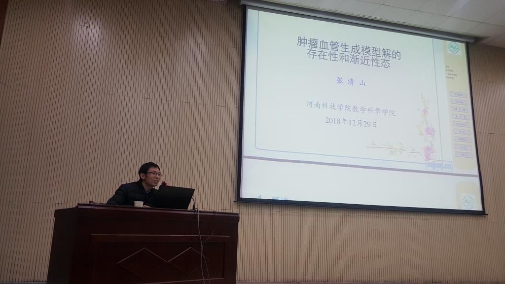 12月29日,我院校级特聘教授张清山博士在新图书馆一楼报告厅为大家做了一场题为“Global existence and large time behavior of angiogenesis system”的报告,报告由数学科学学院院长张万芹主持,数学科学学院200余师生参加了报告会。