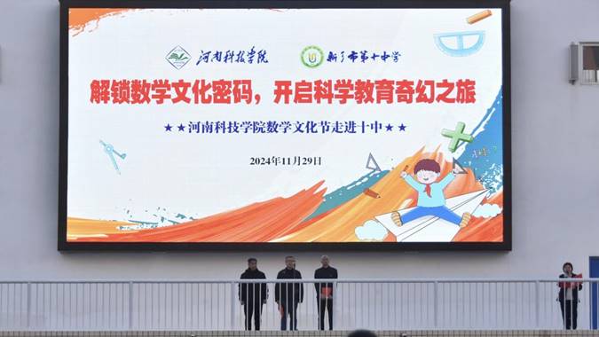 11月29日,河南科技学院走进新乡市十中,组织开展以“解锁数学文化密码,开启科学教育奇幻之旅”为主题的“数学文化节”活动。数学科学学院党委书记李军民、党委副书记马宝林、新乡市第十中学校长杜宇等出席。