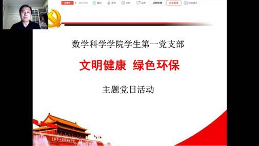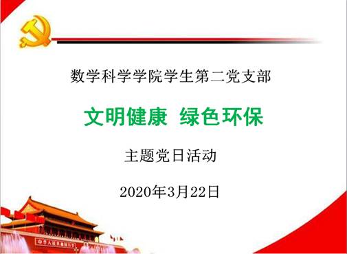 为深入贯彻落实习近平总书记重要指示精神,坚持做到“八个带头”,带动全社会向文明健康、绿色环保的生活方式转变。3月22日,数学科学学院学生党支部组织开展“文明健康我带头,绿色环保我先行”线上主题党日活动。