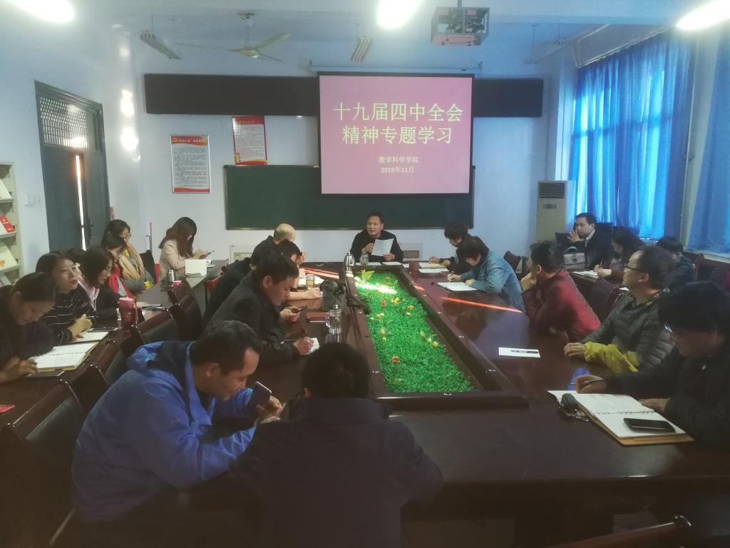 11月14日下午,数学科学学院在学院会议室召开党的十九届四中全会精神专题学习会议。学院全体教职工参加会议,会议由院党委书记任建成主持。