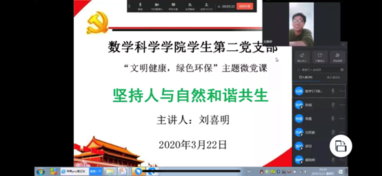 在学生第二党支部的微党课活动中,支部书记刘喜明老师以“坚持人与自然和谐共生”为主题展开论述,他引用习近平总书记“要像保护眼睛一样保护生态环境,像对待生命一样对待生态环境;绝不能以牺牲生态环境为代价换取经济的一时发展。”的经典论述,勉励大家要每个人要从自身做起,这样才能积小流汇成江河,全国人民一起努力建设出望得见山、看得见水、记得住乡愁的美丽中国。