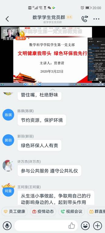 学生第一党支部的微党课由支部书记贾普君老师主讲,他就当前形势做了分析,指出在疫情转好,人们生活逐渐回归正轨的当下,推进师生健康文明绿色环保的生活方式尤为重要,他要求全体党员要带头提升思想认识、践行绿色生活、强化清洁卫生、参与公共服务等倡议,积极营造文明健康、绿色环保生活方式的浓厚氛围,要认真梳理总结推广成熟经验、典型做法,形成示范引领效应。