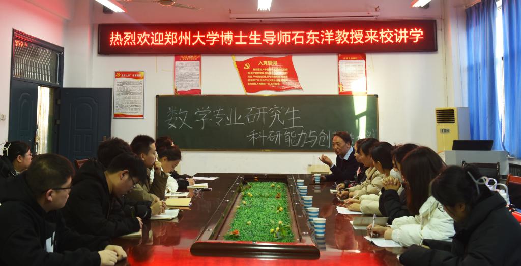 1月5日下午在八号楼三楼会议室,数学科学学院邀请郑州大学博士生导师石东洋教授为全体研究生做“数学专业研究生科研能力与创新能力培养”的专题讲座。讲座由学院党委副书记马宝林主持。