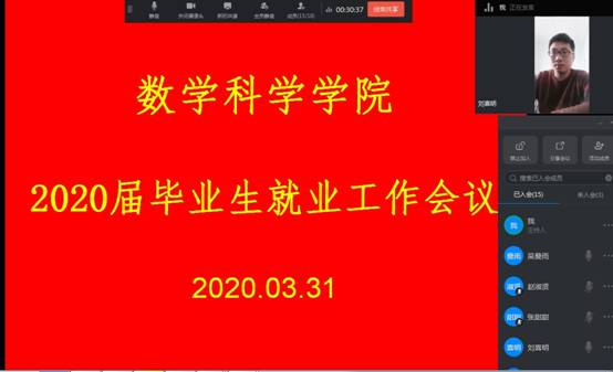 为推进和做好2020届毕业生在疫情防控期间的就业工作,根据校就业处《关于进一步做好2020届毕业生疫情防控期间就业工作的通知》的文件精神,3月31日中午,我院召开疫情防控期间毕业生就业工作视频专题会议。会议由院团委书记贾普君老师主持。院团委副书记刘喜明老师、就业工作相关学生干部及2020届毕业班级负责人参加会议。
