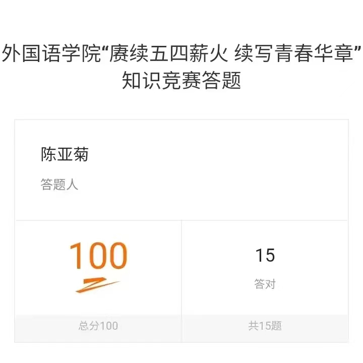 外国语学院组织学生开展“赓续五四薪火续写青春华章”知识竞赛答题活动,通过以赛促学、以学促行的方式检查学生们对党史、团史以及五四运动等知识的掌握情况,引导学生们加强理论学习,争做与新时代共同奋进的时代新人。