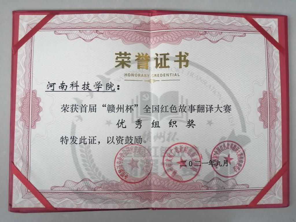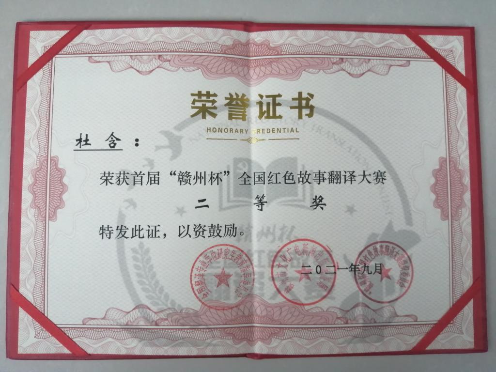 近日,首届“赣州杯”全国红色故事翻译大赛结果揭晓,我院杜含同学喜获二等奖,外国语学院荣获优秀组织奖荣誉称号。