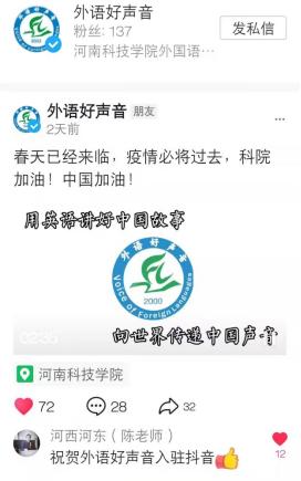 “外语好声音”旨在建立一个融思想引领、思政贯通、师生互动、媒介互融为一体的网络育人平台,以向外界传递科院正能量、向学生讲述思政好故事为目标,充分挖掘思政教育的优秀资源,结合英语学科特点,采取“自己学、自己做、自己讲”的方式,讲述身边的励志故事、校园正能量、红色革命故事、优秀传统文化故事,通过“外语青苑”微信视频号、“外语好声音”抖音平台等新媒体,以“中英双语”同播的方式,向大学生传递科院正能量,营造人人讲思政、处处有思政的良好氛围,将“立德树人”覆盖到课上课下、线上线下、校内校外,推动育人场域向网络延展,育人内容向网络延伸,以润物细无声的方式不断推进网络思政教育入脑入心,构建具有向心力、影响力、感染力的网络思政协同育人机制,探索网络协同育人新模式。