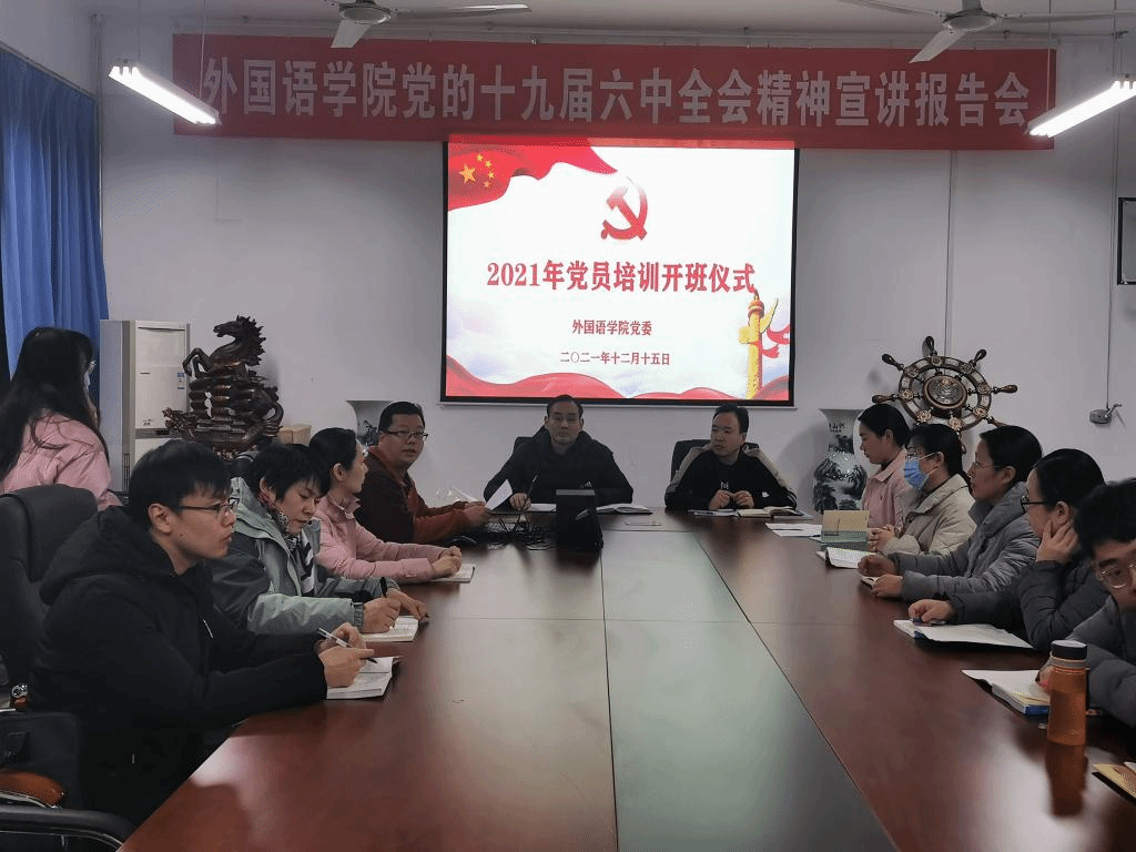 12月15日晚,外国语学院在7211会议室举行2021年党员培训班开班仪式。学院党委书记张忠迪,党委副书记龚俊朋,团委书记张高峰,教师党员代表及全体学生党员参加开班仪式。开班仪式由张高峰主持。