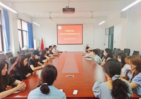 为进一步加强2023届毕业生党员党性教育和廉洁自律意识,引导毕业生党员扣好廉洁从业第一粒扣子,6月2日上午,外国语学院在7211会议室召开2023届毕业生党员廉洁教育大会。团委书记张高峰、辅导员张萌、2023届毕业生党员参加了会议。