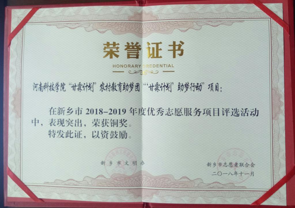 近日,从新乡市文明办获悉,外国语学院“甘霖计划”农村教育助梦工程服务项目被评为新乡市2018-2019优秀志愿服务项目并荣获铜奖。