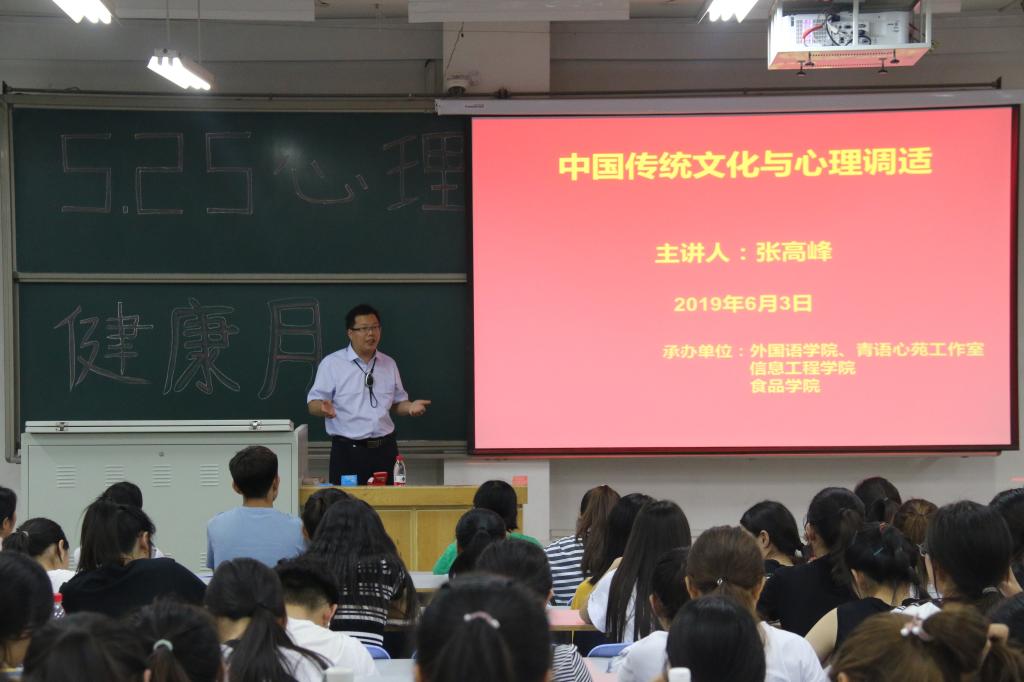 6月3日晚,由外国语学院青语心苑工作室、信息工程学院和食品学院共同承办的中国传统文化与心理调适心理讲座在10#5教室顺利举行,230余名学生代表参加讲座。外国语学院团委书记张高峰担任此次讲座主讲人,信息工程学院团委书记王明艳主持。
