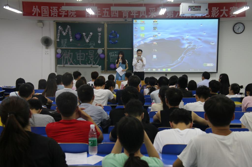 6月20日晚,外国语学院“百年五四,青年风采”第六届微电影大赛在8#二教室举行。信息工程学院团委书记王明艳、党委宣传部理论教育科副科长隋延亭、外国语学院团委书记张高峰,团委副书记时文鹏参加活动并担任评委,外国语学院及信息工程学院二百余人参加活动。