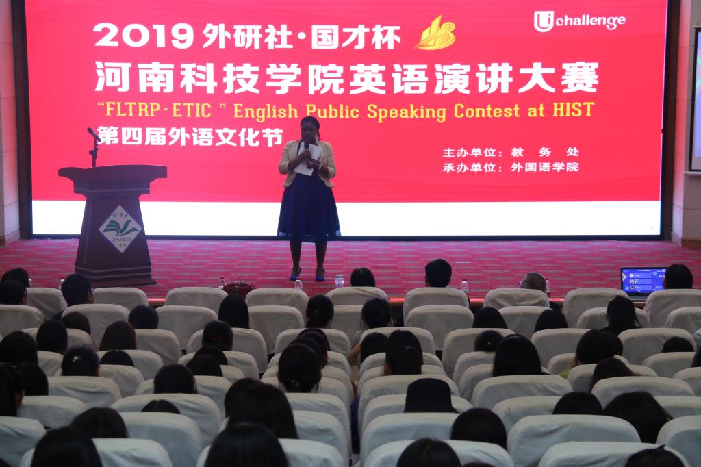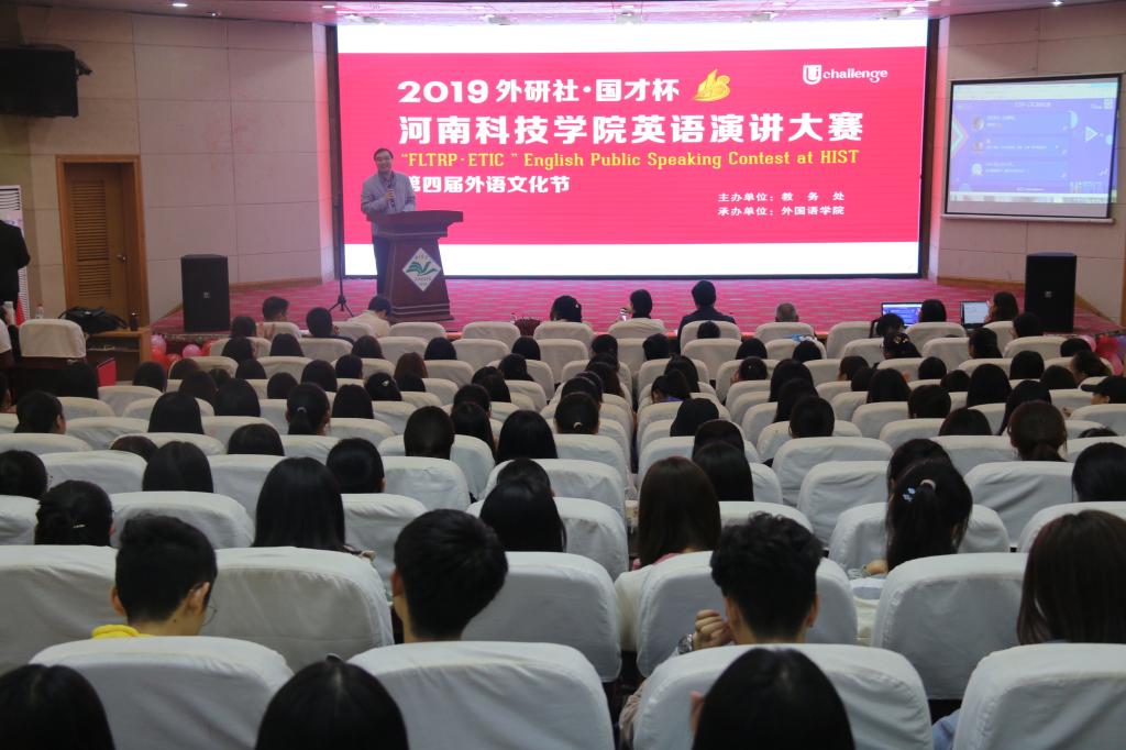 10月11日晚,由教务处主办、外国语学院承办的“2019年外研社•国才杯河南科技学院英语演讲大赛”在图教201隆重举行。学校有关职能部门负责人,各学院教师和学生代表300余人观看比赛。