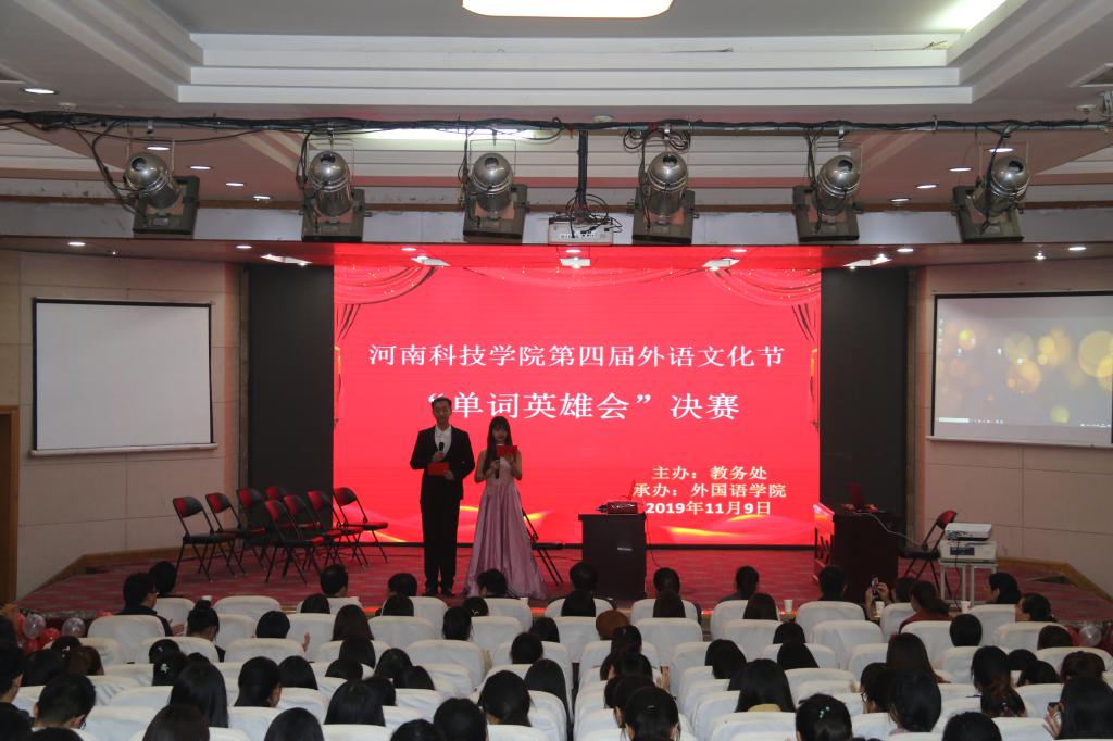 为提高学生英语学习热情,11月9日晚,由教务处主办、外国语学院承办的第四届外语文化节之单词英雄会决赛在图教201举行。教务处副处长赵新亮,经济与管理学院党委副书记王彦杰,信息工程学院党委副书记张建设,外国语学院副院长李会民、党委副书记龚俊朋及学院师生近200人观看比赛。